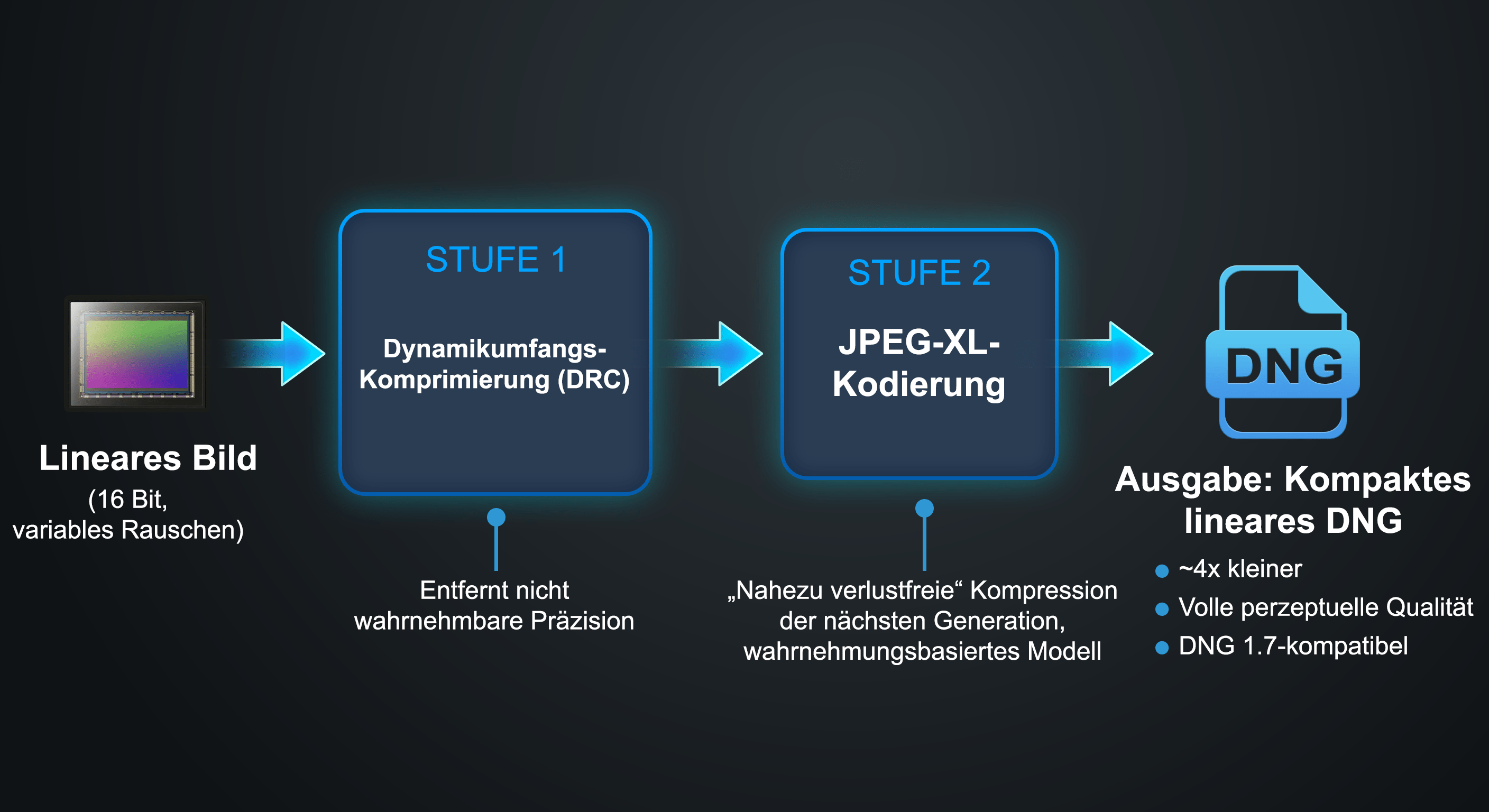 Nach der DRC wird das aufbereitete Bild mit dem Bildcodec JPEG XL komprimiert, einer vom JPEG-Komitee standardisierten Technologie der nächsten Generation.