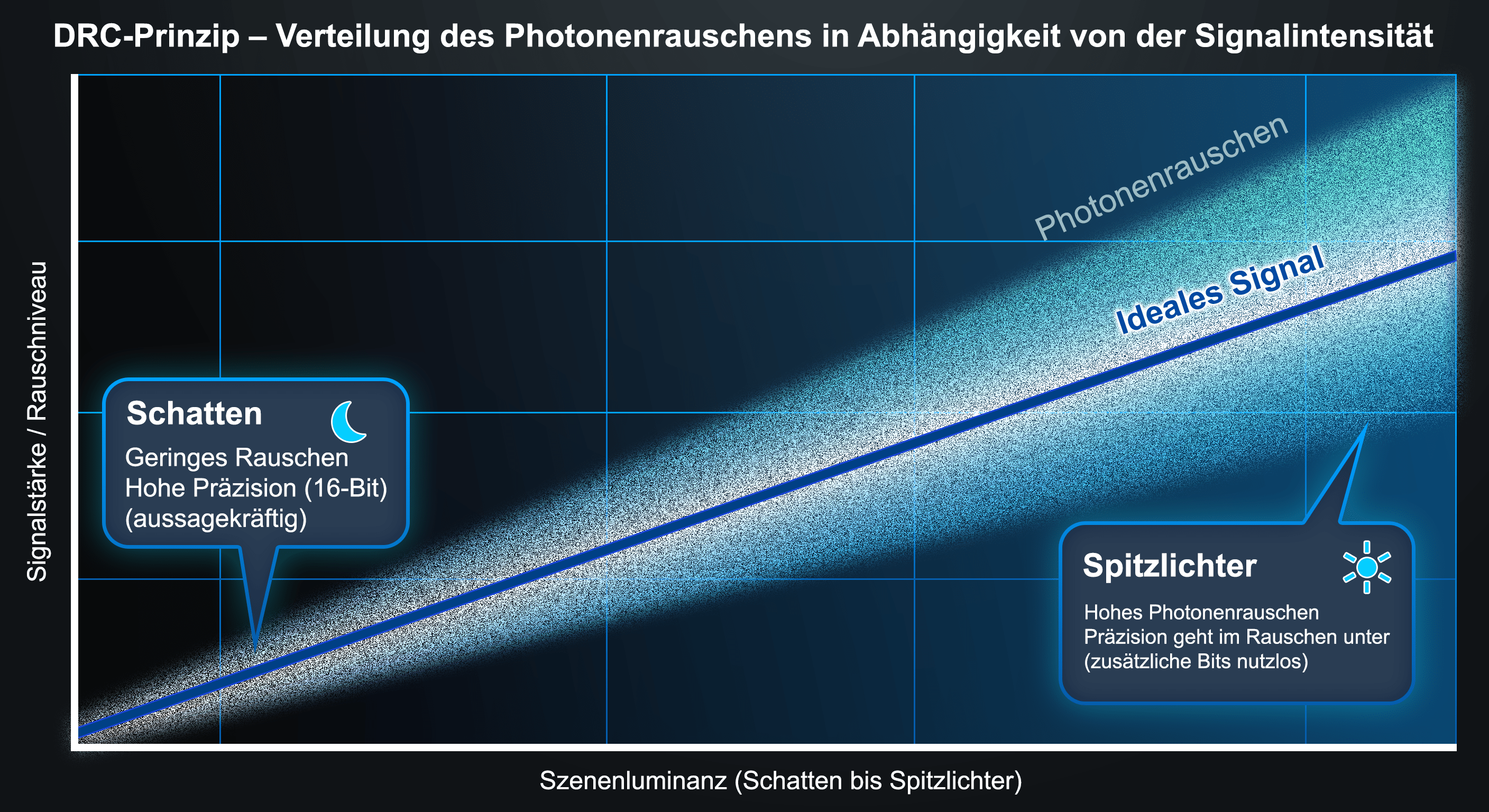 - In dunklen Bildbereichen ist das Rauschen sehr gering, und das Signal ist fein strukturiert. Jedes einzelne Bit an Pixelpräzision kann wertvolle Bildinformationen enthalten — weshalb in vielen Fällen 14 oder sogar 16 Bit erforderlich sind.