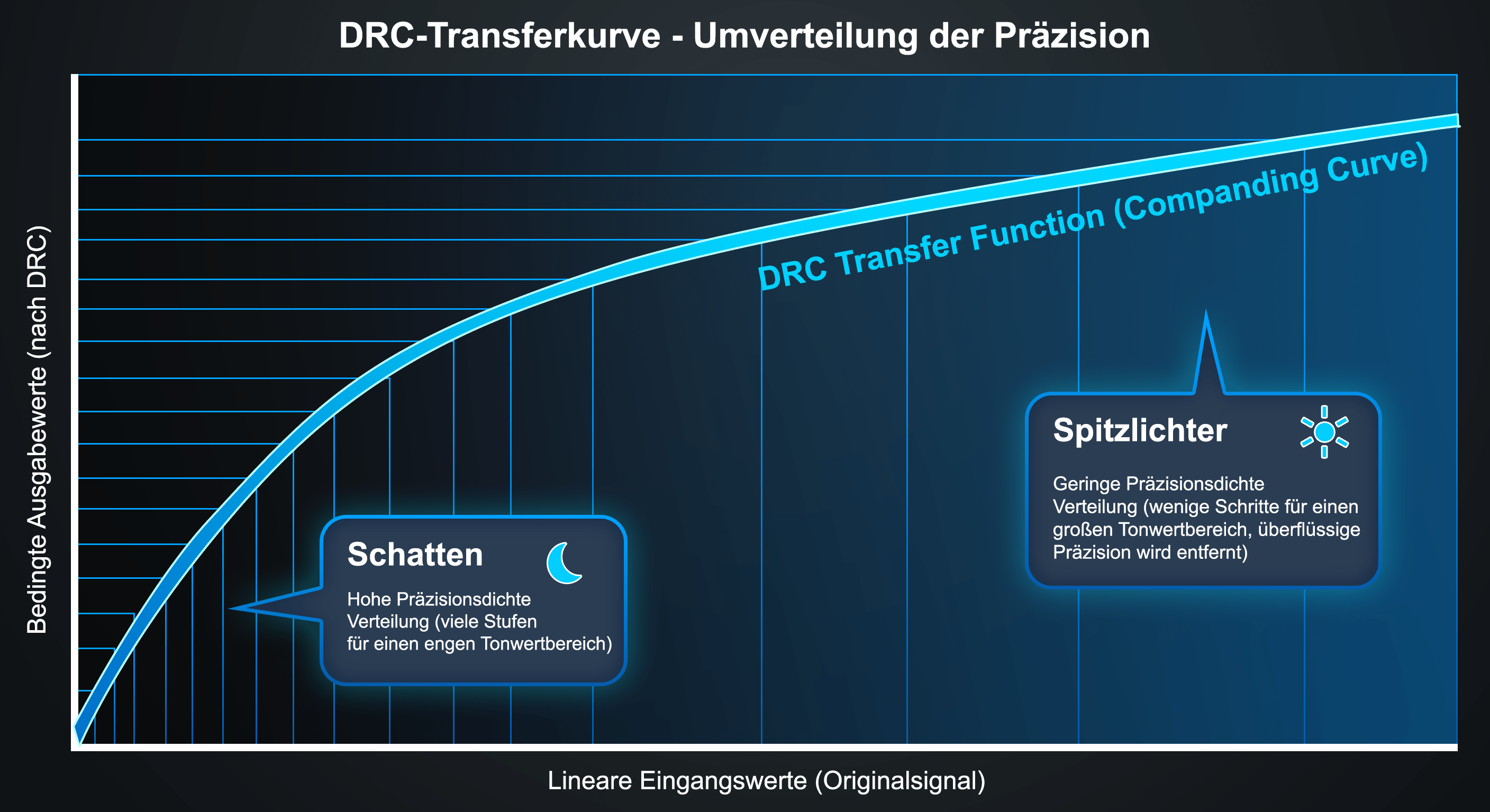 - DRC behebt dieses Problem, indem es vor der Komprimierung eine Kompandierungsfunktion — konkret eine Kurve nahe der Quadratwurzel — auf die linearen Pixelwerte anwendet. Dies ist konzeptionell mit einer varianzstabilisierenden Transformation vergleichbar: Nach der Quadratwurzel wird die Standardabweichung des Rauschens über den gesamten Tonwertumfang hinweg nahezu konstant. Die Präzision wird somit dort zum Einsatz gebracht, wo sie erforderlich ist — viele Abstufungen in den Schatten, weniger in den Spitzlichtern — ohne dass Informationen verloren gehen, die für die Wahrnehmung von Bedeutung sind.