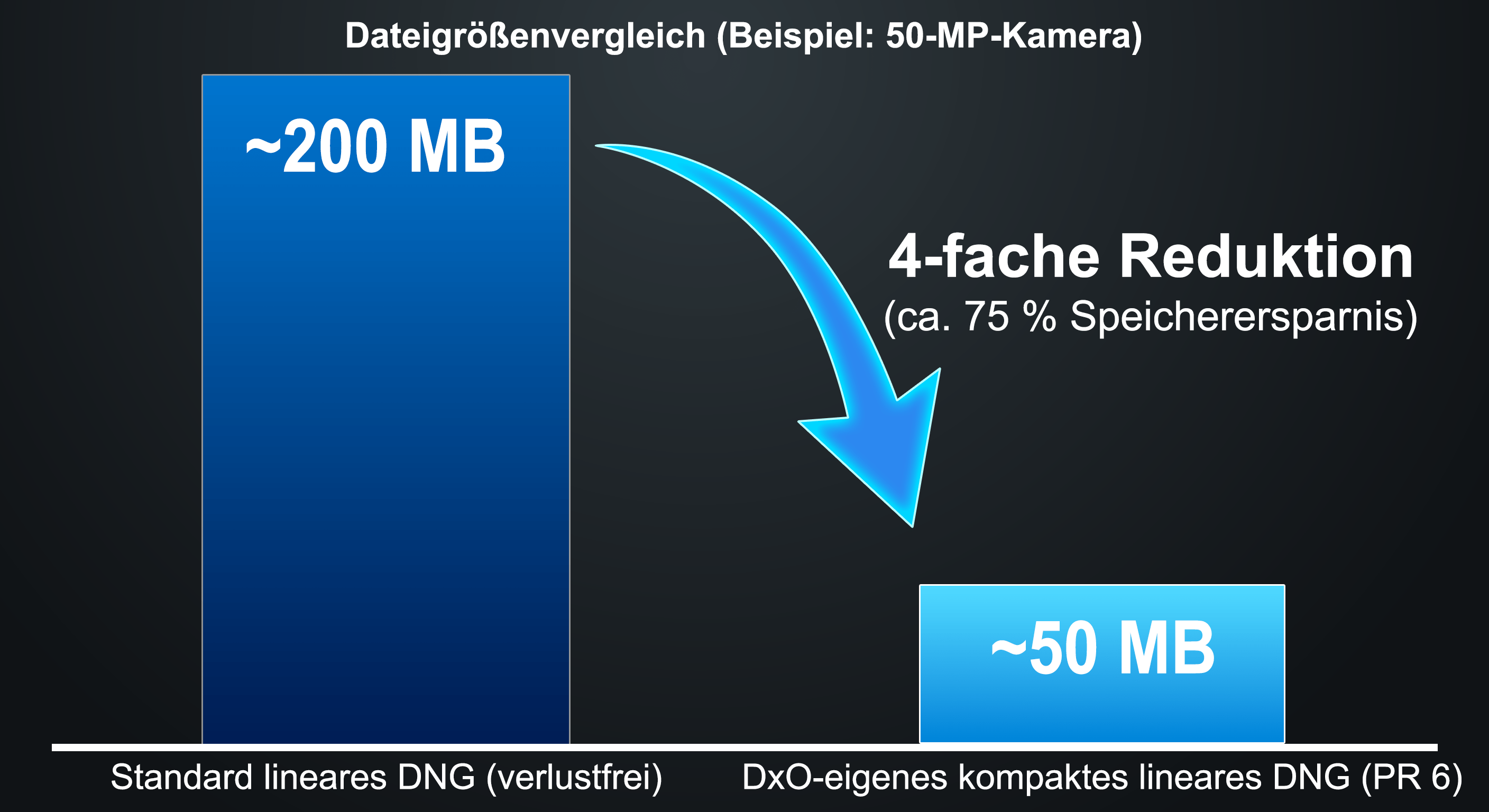 Lineares DNG ist das von DxO empfohlene Ausgabeformat für DxO PureRAW, da es den maximalen Bearbeitungsspielraum bewahrt und zugleich eine umfassende Kompatibilität mit RAW-Prozessoren von Drittanbietern gewährleistet. Trotz der in der DNG-Spezifikation integrierten verlustfreien Komprimierung erreicht eine typische lineare DNG-Datei eine Größe von etwa 4 MB pro Megapixel. Bei einer 50-MP-Kamera entspricht dies 200 MB pro Bild.