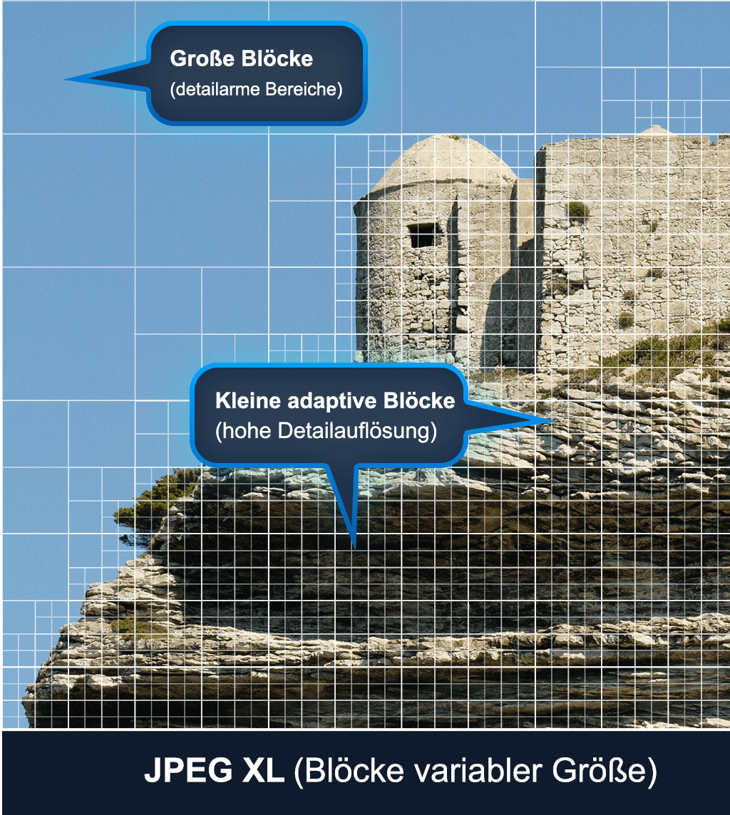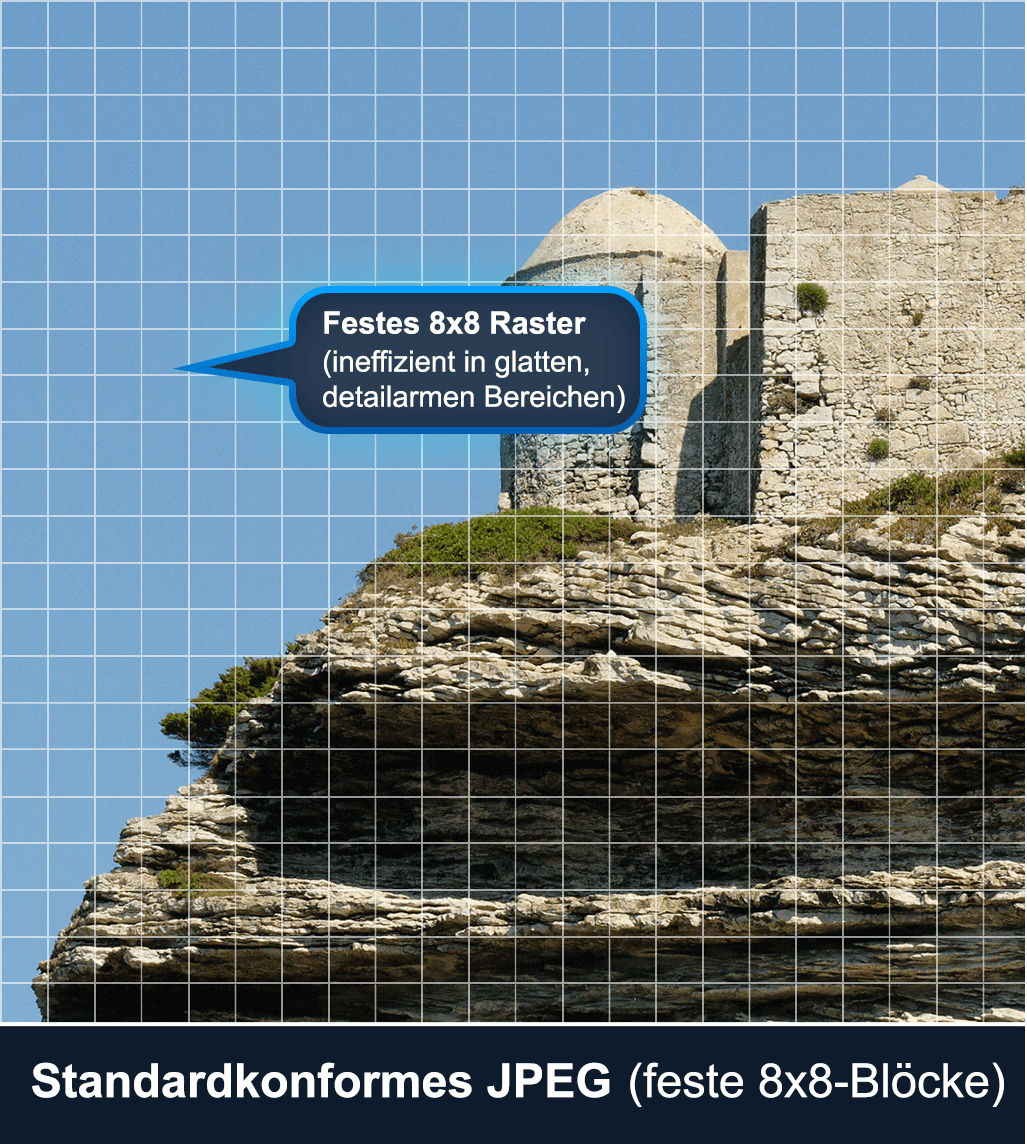 Das klassische JPEG stammt aus dem Jahr 1992 und basiert auf einer festen 8 x 8 -Blocktransformation mit vergleichsweise einfacher Entropiekodierung. So bahnbrechend er damals war, lässt dieser Ansatz nach heutigem Maßstab erhebliches Komprimierungspotenzial ungenutzt. JPEG XL bündelt über zwei Jahrzehnte Fortschritte in der Bildkomprimierungsforschung: