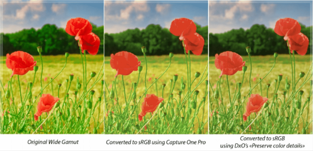 Daher bleiben mit DxO Wide Gamut alle Tonwerte und Details erhalten, wenn diese Farben nach der Bearbeitung schließlich als Ausgabefarben dargestellt werden.