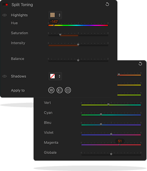 Les outils de traitement des couleurs dans DxO FilmPack 8 vous offrent à la fois créativité et précision. Grâce à l'outil Virage, vous pourrez appliquer des teintes différentes aux tons clairs et aux tons sombres, et ainsi donner une ambiance ou un caractère vintage à vos images. Quant aux curseurs Teinte/Saturation/Luminance (TSL), ils vous permettront d’affiner chaque plage de couleur, idéal pour sublimer un ciel, égaliser les teintes de peau ou atténuer les dominantes de couleur.