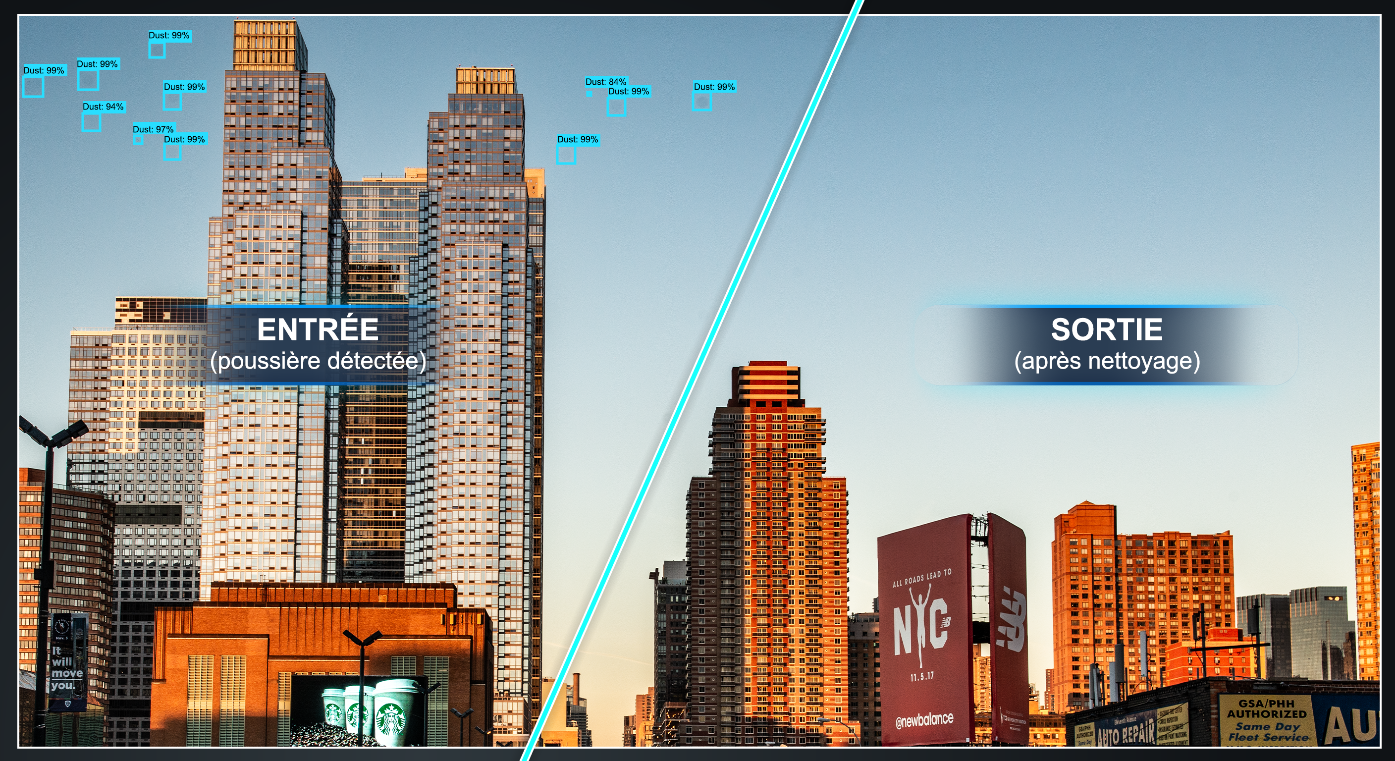 Une surface minuscule. En pleine résolution, une tache de poussière ne couvre en général que quelques pixels, ce qui est trop peu pour que les détecteurs d’objets généralistes, qui sont optimisés pour détecter des personnes ou des véhicules, parviennent à la repérer.