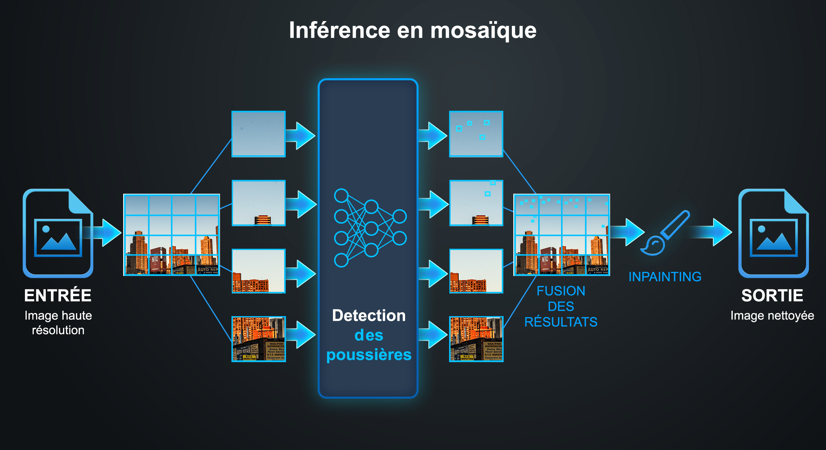 Cette approche synthétique garantit une distribution homogène des caractéristiques des poussières et des arrière-plans sur l’ensemble des données d’entraînement, et évite donc les biais qui surviennent inévitablement quand l’ensemble de données est constitué manuellement. Elle garantit par exemple que le réseau voit suffisamment de taches très légères, suffisamment de taches très petites et suffisamment d’arrière-plans inhabituels, des combinaisons qui seraient forcément sous-représentées dans une collection composée uniquement de vraies images.