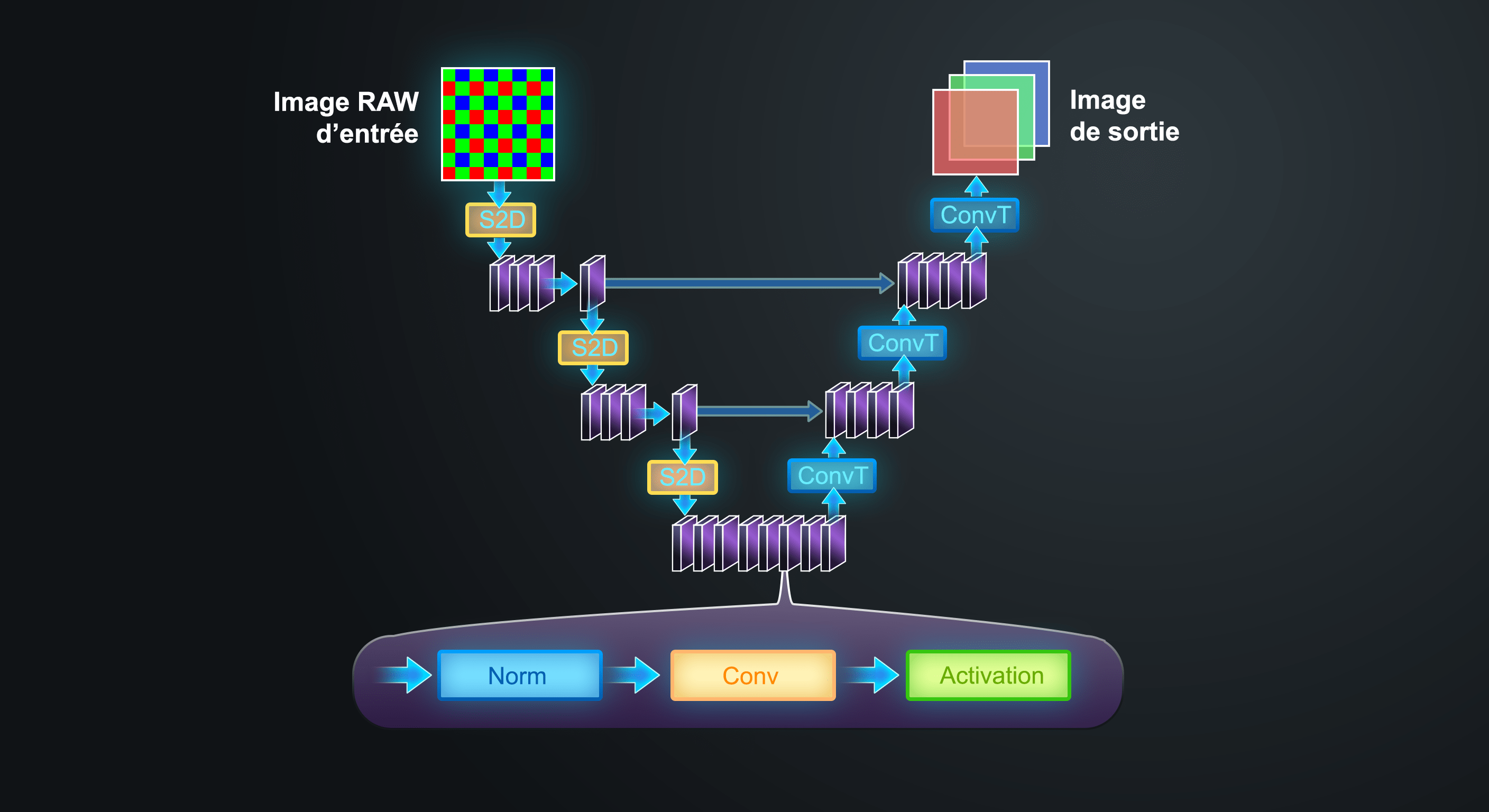 Puisque nous voulions ajouter une troisième tâche et obtenir une meilleure qualité de dématriçage, il nous fallait un réseau plus puissant. L’équipe a commencé par étudier toutes les possibilités. Des architectures de type Transformeur, qui dominent aujourd’hui de nombreux domaines du deep learning, ont été testées aux côtés de nombreuses architectures de réseaux neuronaux convolutifs (CNN). Pour cette tâche précise (récupérer des détails précis sur des zones très localisées à partir de données bruitées et incomplètes), ces derniers se sont révélés plus efficaces. Leur biais local intrinsèque, qui concentre l’analyse sur de petits voisinages spatiaux, favorise naturellement le lissage du bruit sans pour autant halluciner des structures inexistantes. Les transformeurs, qui modélisent les dépendances à longue portée, avaient plutôt tendance à laisser passer le bruit au lieu de le supprimer. Pour un débruiteur, le biais des réseaux neuronaux convolutifs, qui privilégient la régularité locale, est un plus un atout qu’une limitation.