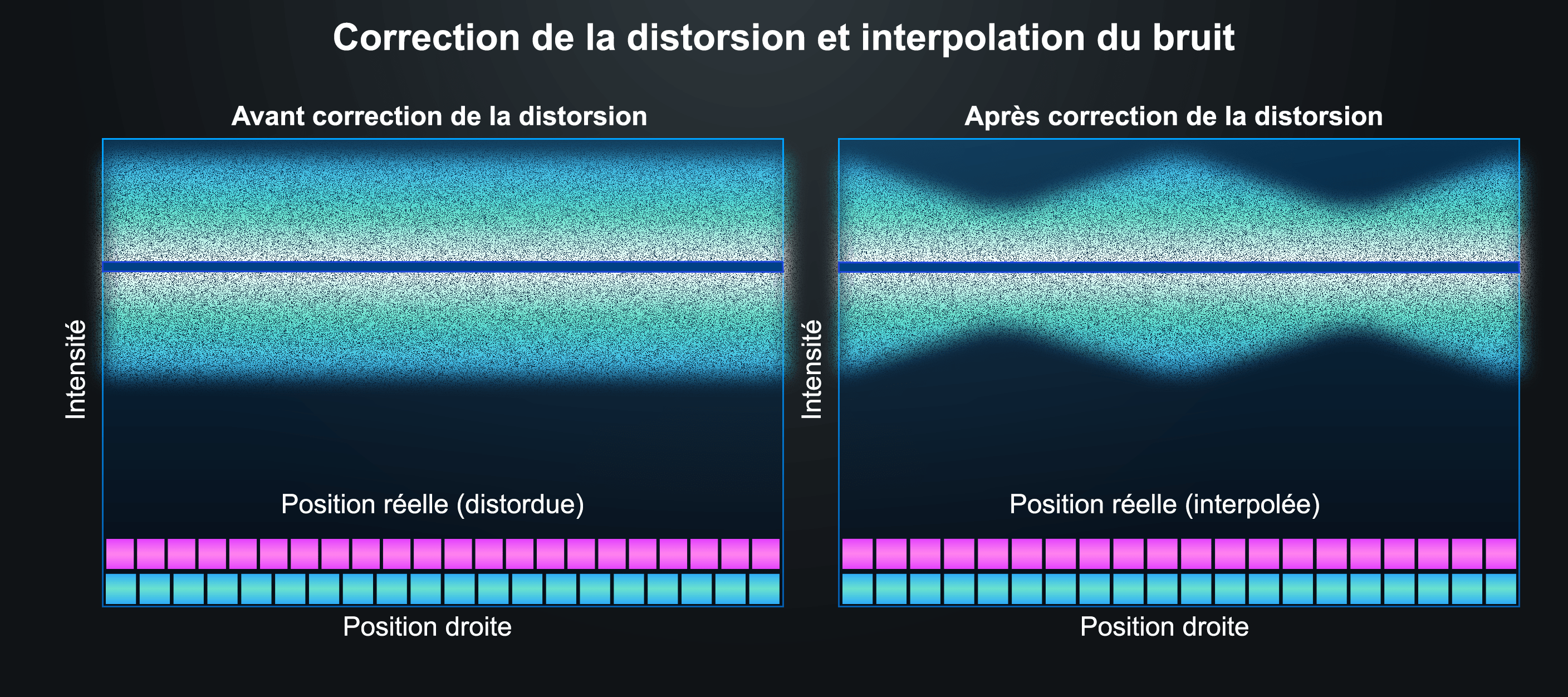 Distorsion. La correction de la distorsion nécessite une interpolation géométrique de la grille de pixels. Appliquée au bruit blanc, l’interpolation introduit deux effets indésirables : elle crée des structures parasites dans le bruit et provoque des variations périodiques de son niveau. Aux endroits où la coordonnée interpolée coïncide avec un pixel réel, le bruit est conservé tel quel. En revanche, aux endroits situés entre deux pixels, le bruit est lissé et son niveau chute. Dans DxO PureRAW 6, nous avons résolu ce problème en appliquant séparément un algorithme d’interpolation spécialisé à la composante de bruit, pour garantir un niveau de bruit uniforme après correction de la distorsion.