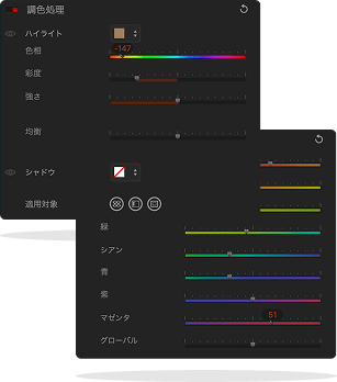 スプリットトーン(分割調色処理)および色相/彩度/輝度ツール