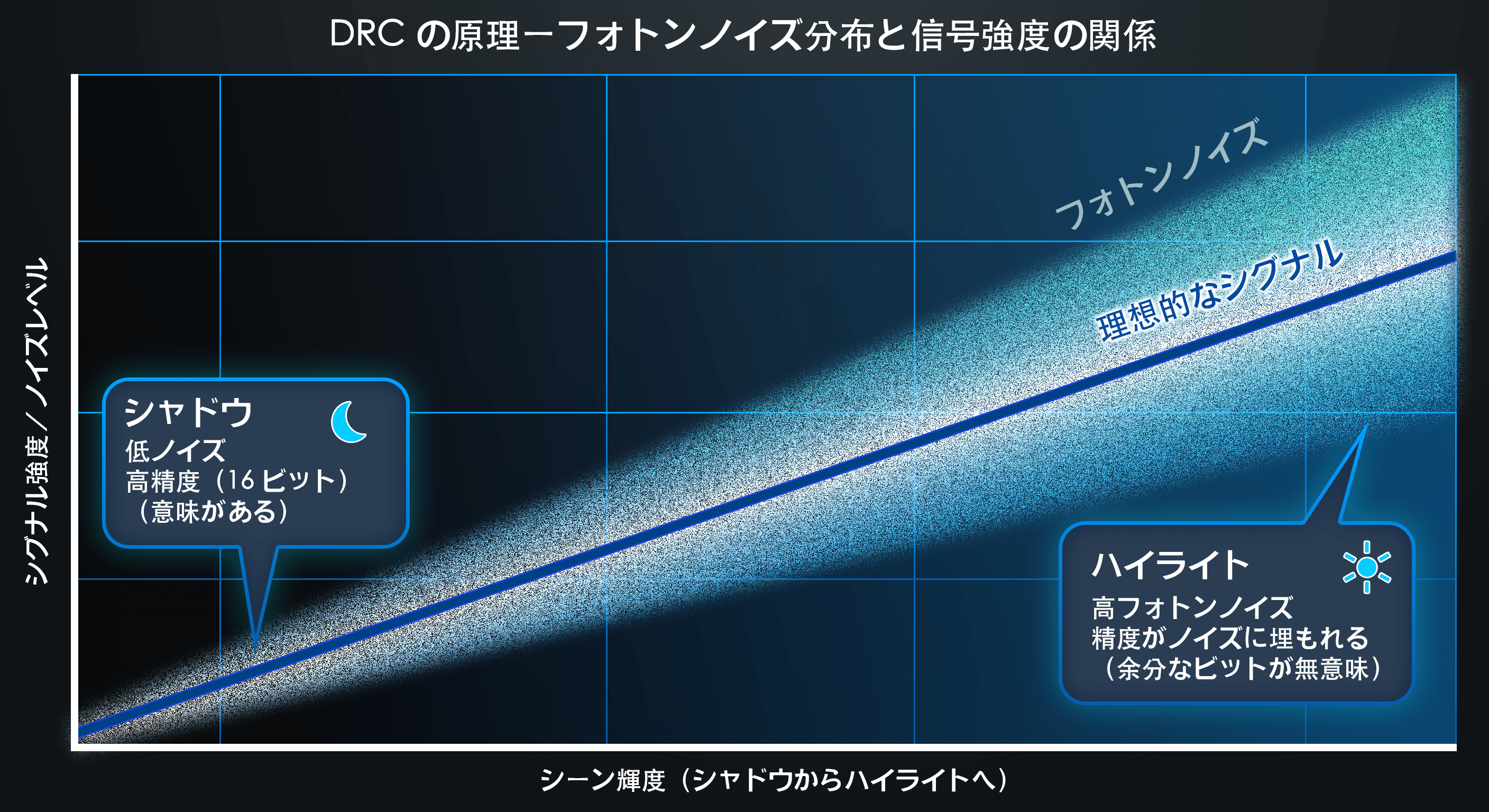 - 暗部では、ノイズは非常に少なく、信号は精緻な構造を持っています。 精度のあらゆるビットが真に有用な情報を含んでいる可能性があり、14ビット、あるいは 16ビットが必要になる場合もあります。