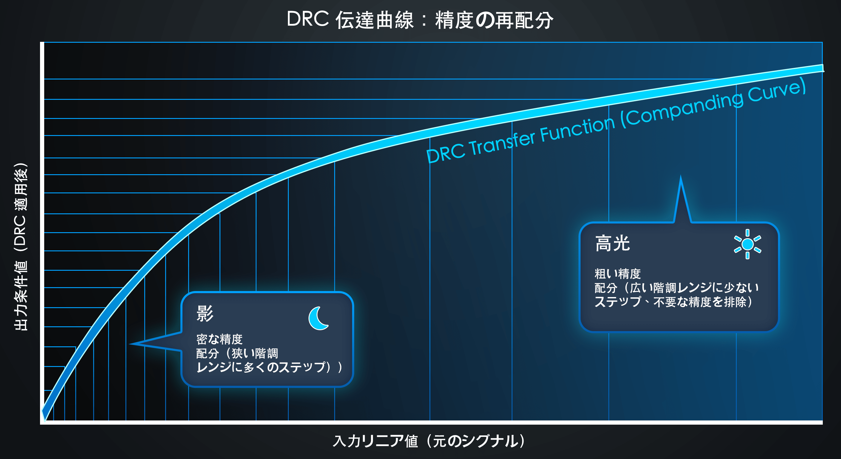 ダイナミックレンジ圧縮(DRC)は、オーディオ信号処理の分野で広く知られている技術です。 コンプレッサーは、非線形の伝達関数を適用して信号のダイナミックレンジを圧縮します。オーディオの用語で言えば、大きな音は減衰させ、小さな音は増幅させることで、与えられたビット量の中に信号を効率的に収めるものです。 この原理は、RAW デジタル画像にも極めて適していることが分かっています。
