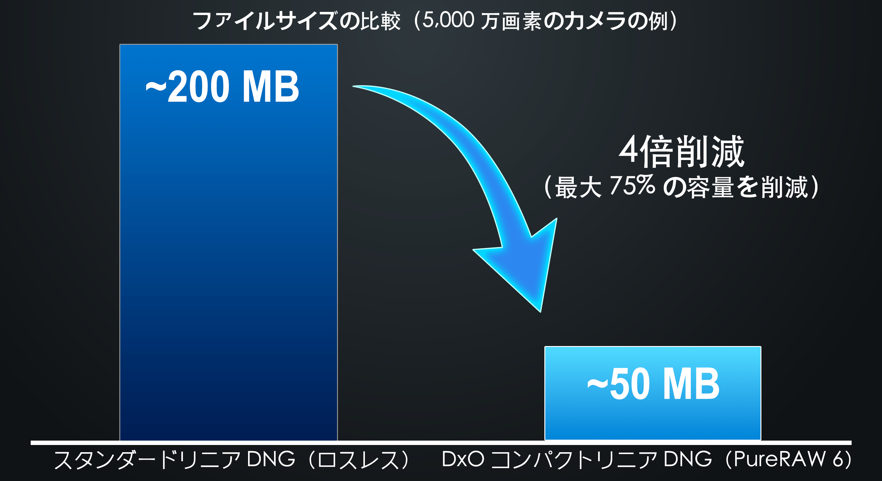 - 1/4 のファイルサイズ:5,000万画素カメラのリニア DNG が、約 200MB から約 50MB に縮小。リニア DNG を、日常的な撮影や大量処理のワークフローで実用的に活用できます。ファイルが小さくなることで、インポートの高速化、クラウド同期の迅速化、ディスク使用量の削減が実現します。