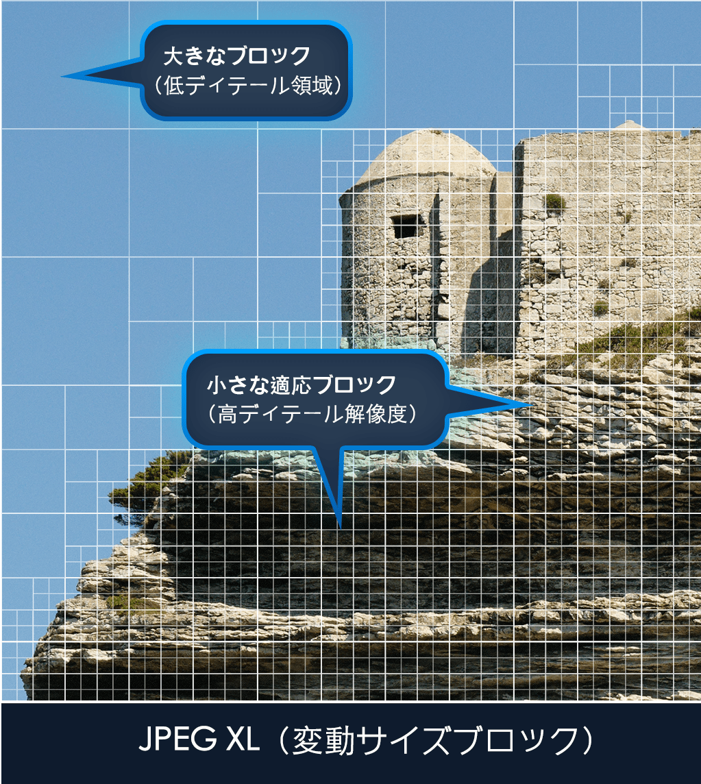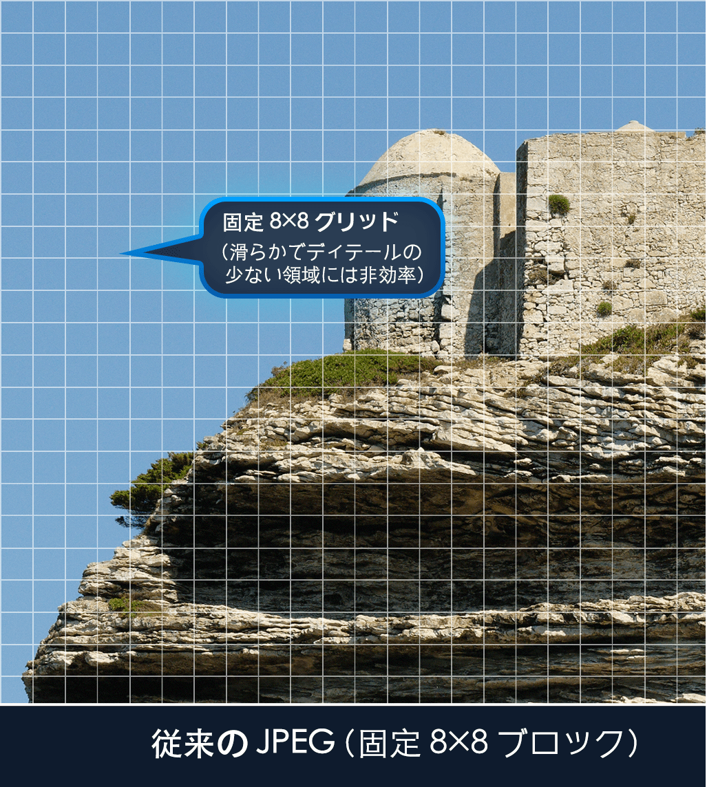 従来の JPEG は 1992年に策定された規格で、固定の 8×8 ブロック変換と比較的単純なエントロピー符号化に依存しています。 当時は画期的でしたが、今日の水準から見ると、このアプローチでは圧縮性能に大きな改善余地が残されています。 JPEG XL は、画像圧縮研究における20年以上の進歩を取り込んでいます。