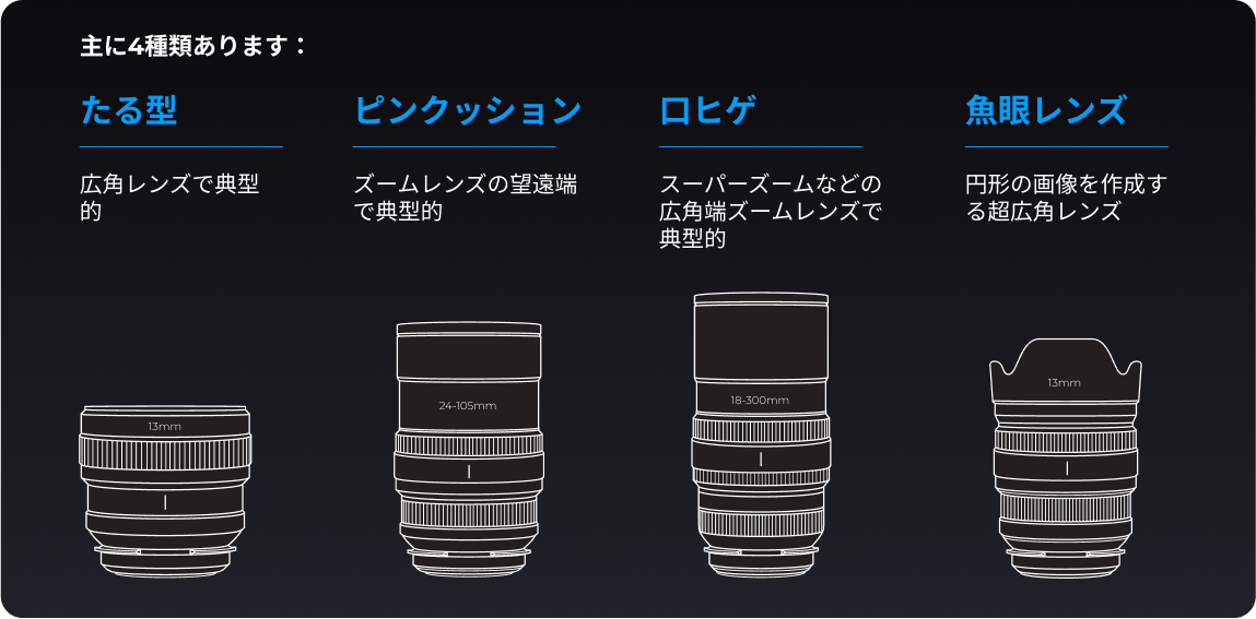 特に標準ズームや広角レンズなどにおいて、 シーンの幾何学的構成を絶対的な精度で捉える ことができるレンズはほとんどありません。 レンズのエレメントはしばしば多くの歪曲を引き 起こします。その多くは軽微ですが、中には 極めて顕著で影響の大きいものもあります。