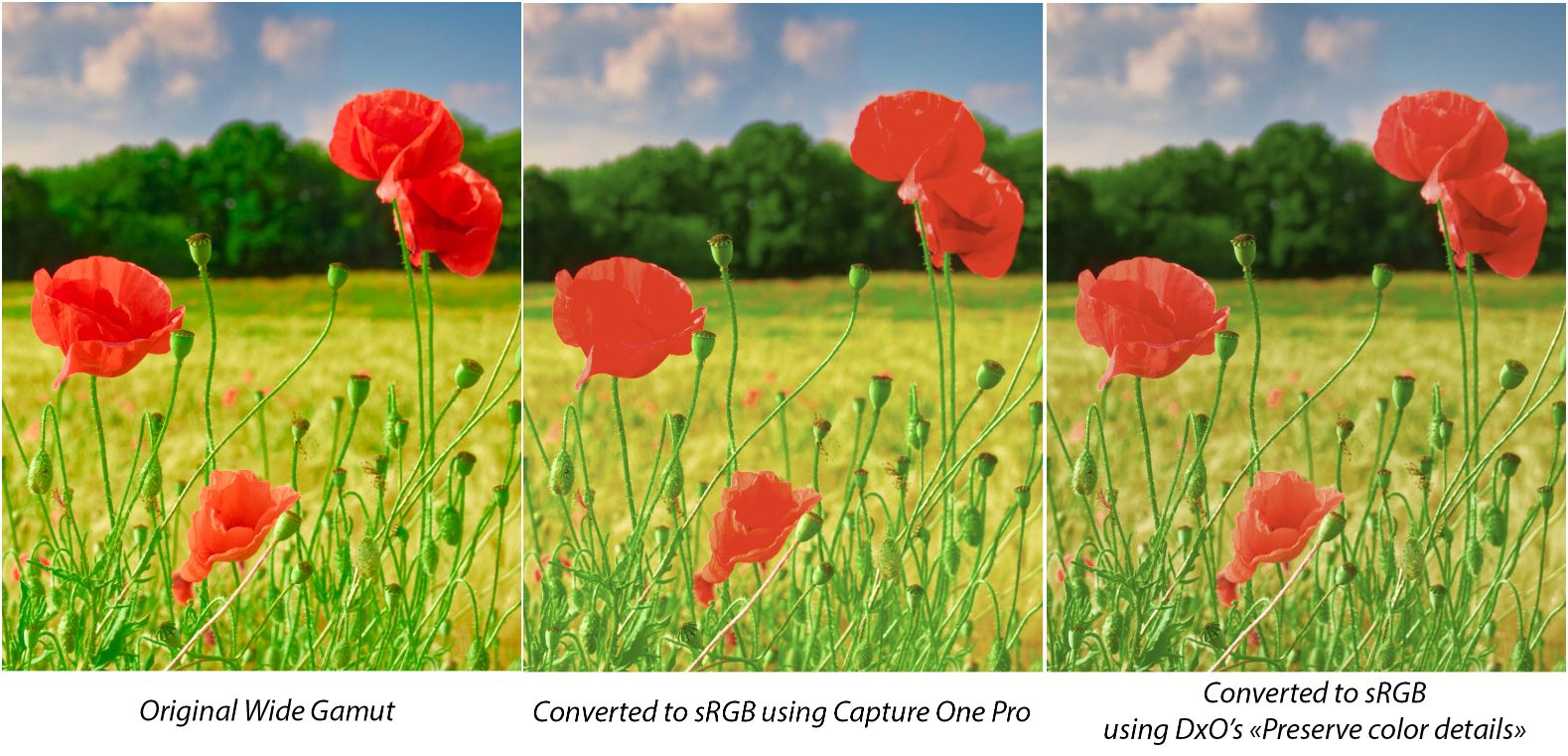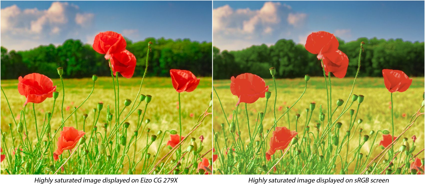 Fig 4: Comparison between wide gamut and sRGB monitors. Notice how, due to some of the values being out of gamut on the sRGB monitor, detail in the poppies’ petals is lost.