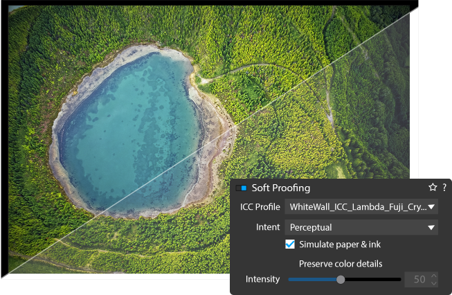 Soft proofing allows photographers to get an on-screen simulation of what an image will look like when displayed or printed on a certain device. It gives an overview of the outcome by emulating the less saturated primaries of a standard screen, or the inks of the printer and the way they physically react with paper.