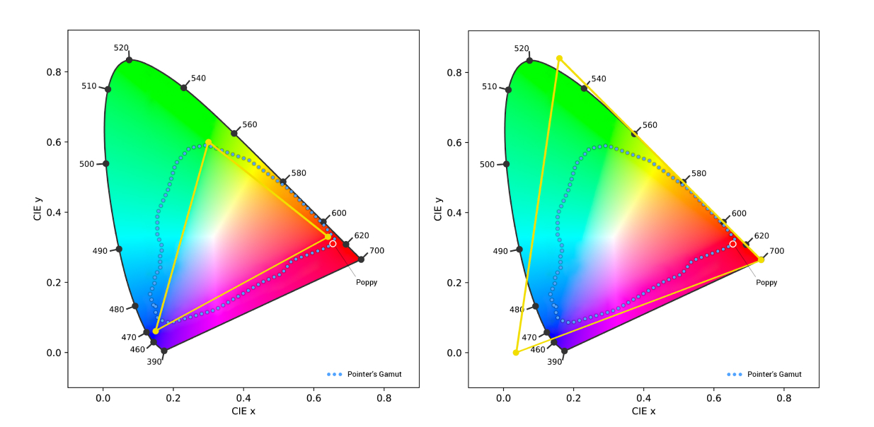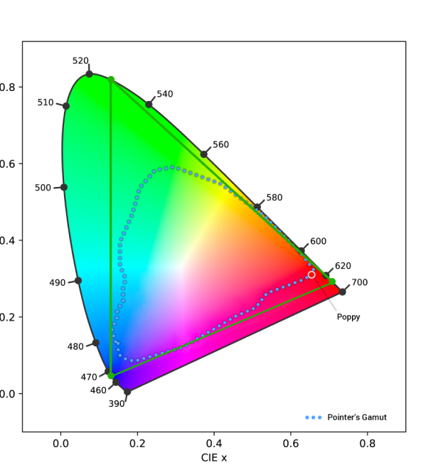 For this reason we decided to design an RGB color space with the widest possible gamut that can be achieved utilizing spectral colors as primaries. The result is a color space that includes close to every color that can be reproduced on the best monitors and printers available today, and encompasses all of Pointer’s Gamut, the 4089 real-world surface color samples collected by scientist Doctor Michael R. Pointer at Kodak Research in 1980. link to https://onlinelibrary.wiley.com/doi/abs/10.1002/col.5080050308