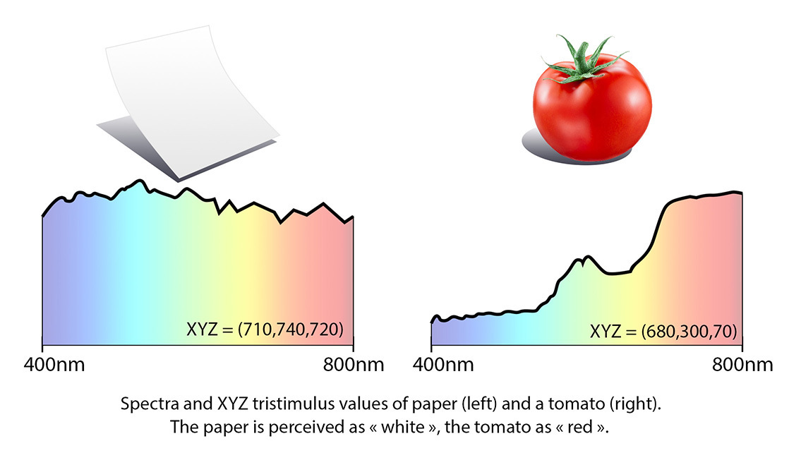 The illustration below shows the spectral power distribution of the light reflected by two different objects — a piece of paper and a tomato – when the objects are illuminated under daylight. Each graph also indicates the corresponding surface color expressed as XYZ values. To the human eye, the paper is perceived as white, while the tomato is perceived as red.