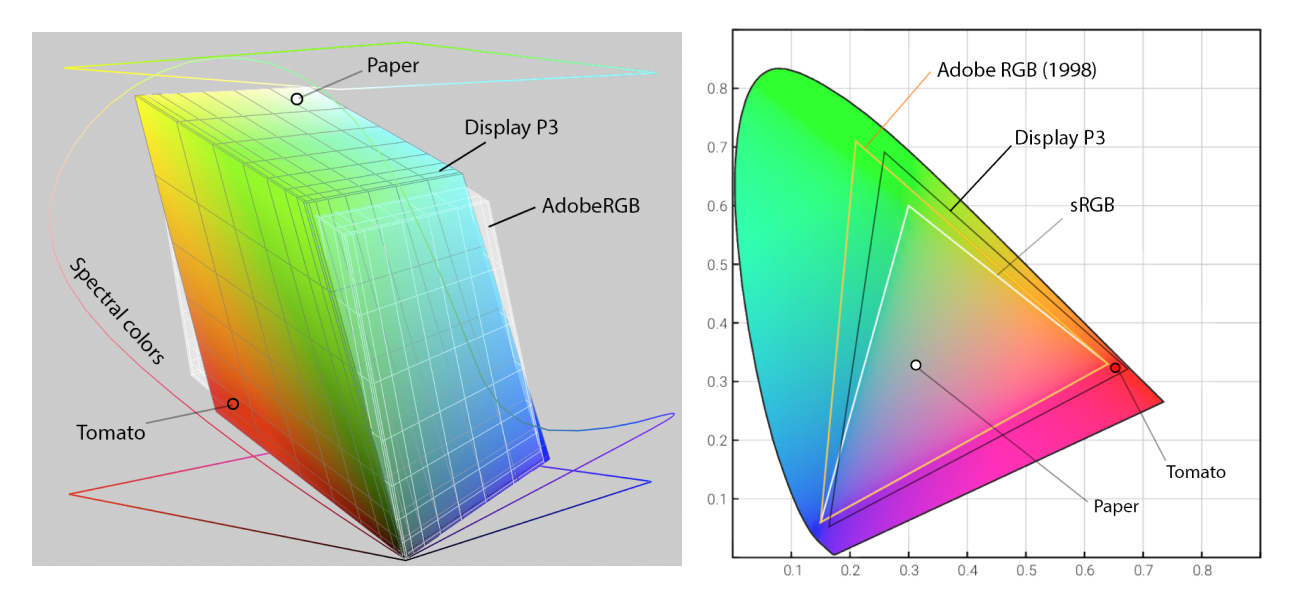 Fig 2: Comparison of the AdobeRGB and Display P3 color spaces in the CIE XYZ color space (left) and CIE chromaticity diagram (right). Notice how, although AdobeRGB and Display P3 are of similar size on the chart, neither is a subset of the other – AdobeRGB contains more cyan, while Display P3 contains more red and yellow.