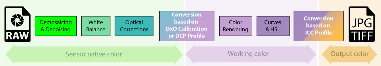 Fig 3: The different color spaces used in DxO’s RAW conversion pipeline