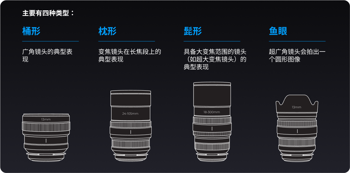 鲜有镜头能绝对精确地捕捉场景的几何形状,尤其是标准变焦镜头和广角镜头。 镜头的各项要素通常会引入各种类型的畸变,虽然许多畸变都很轻微,但有些畸变可能十分突出并产生破坏性的影响。